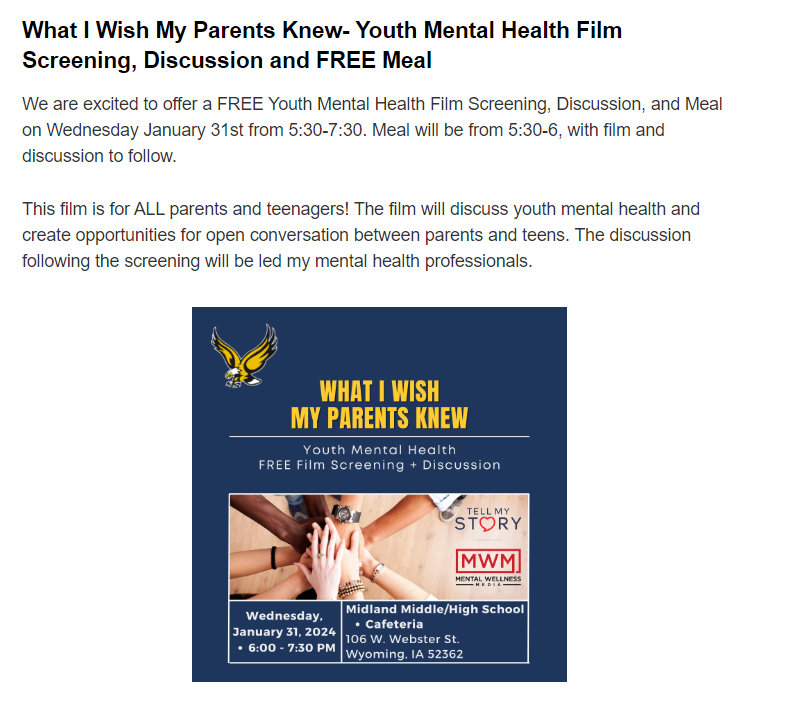 This information was sent out to all 6-12th grade students via ParentSquare on Jan 11th. If questions, reach out to Mackenzie Lasack in the counseling office.