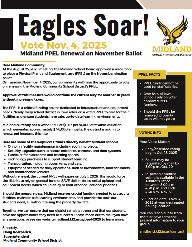 We are incredibly grateful for the strong support shown by our community in passing the recent PPEL measure. Your vote of confidence helps ensure that Midland students continue to have access to safe, high-quality learning environments and the tools they need to succeed.