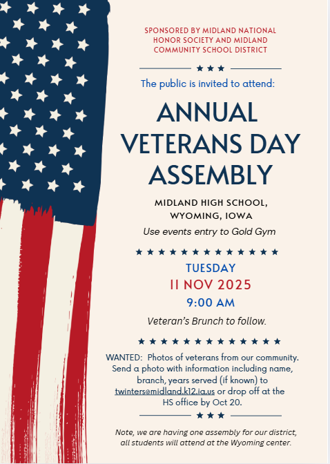 The public is invited to attend our Veterans Day Assembly which is sponsored by our National Honor Society. If questions, reach out to our NHS Sponsor Thomas Winters – 319-259-5340 ext 2440 or twinters@midland.k12.ia.us